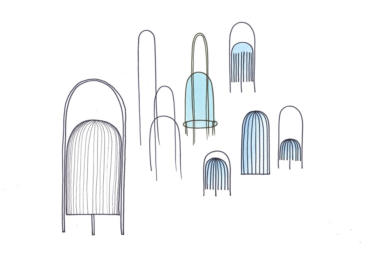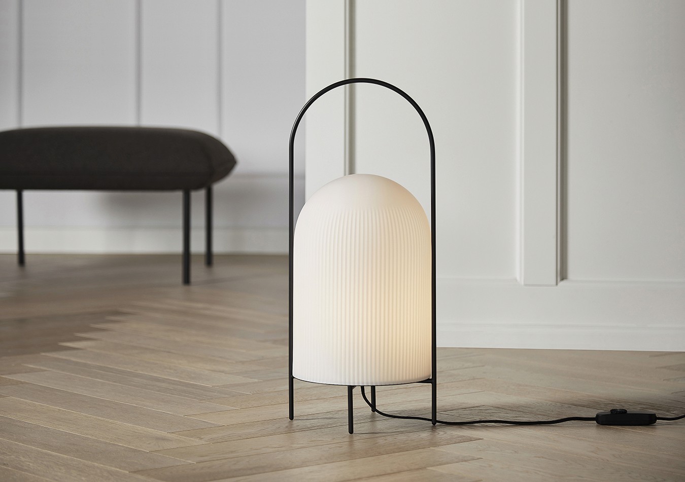 The design of the Ghost lamp is a modern interpretation of antique portable oil lamps. The slim metal rod structure surrounds the lampshade made out of glass protectively and the overarching bail is acting as a handle for carrying the lamp around. Made of handcrafted translucent opal glass, the lampshade looks like a white cloth thrown over the light source and resembling the appearance of a ghost, ultimately giving the design its name.