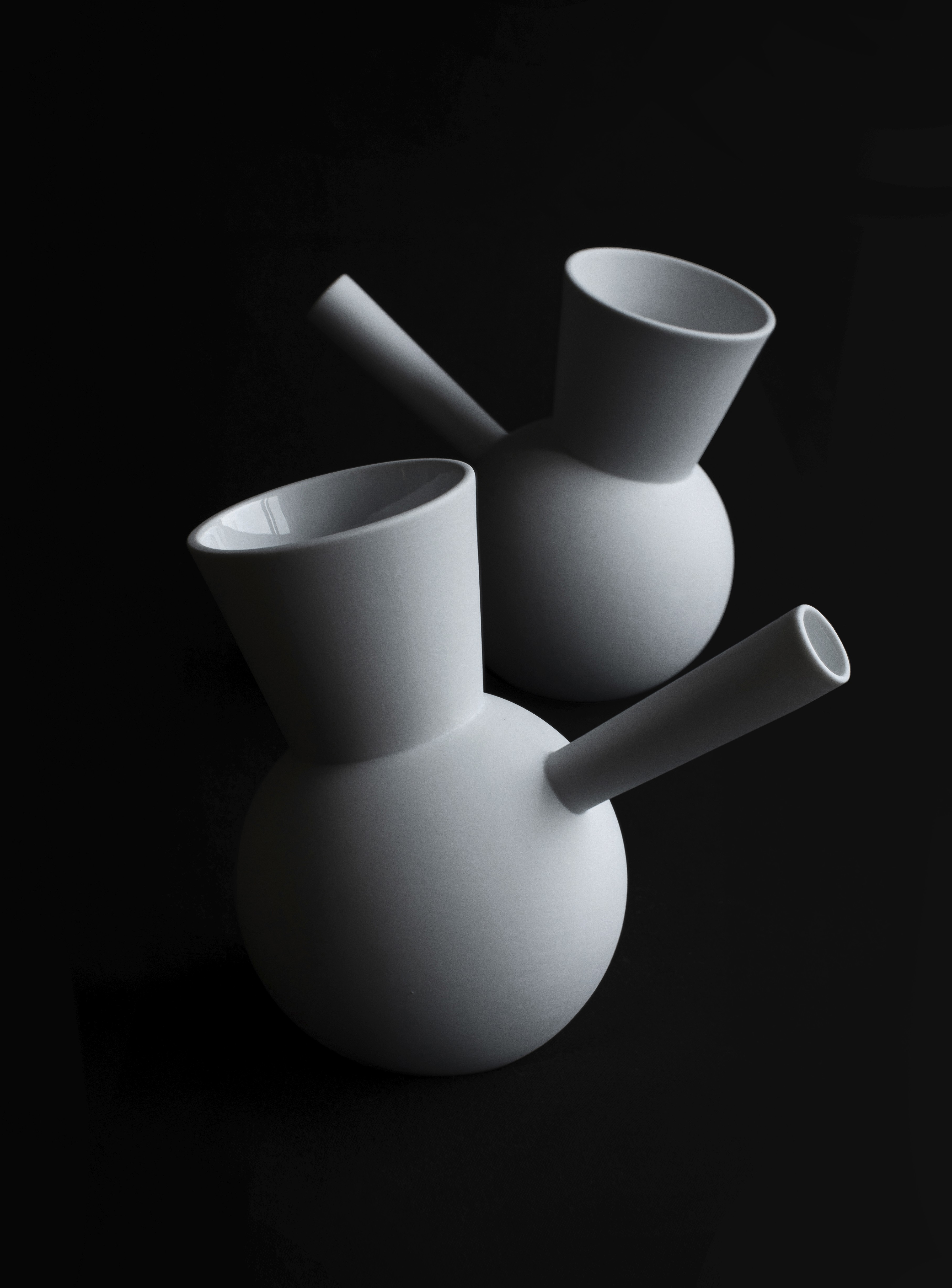 Hopper is a geometric reinterpretation of the classic watering can, designed for small indoor plants. It explores archetypical forms to give a simple household tool a vibrant, sculptural presence. The conical filling funnel also functions as the handle. The contrast between the glazed interior and the matte exterior highlights the natural beauty of the porcelain.