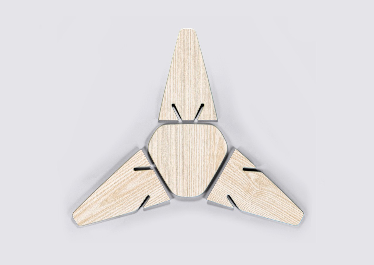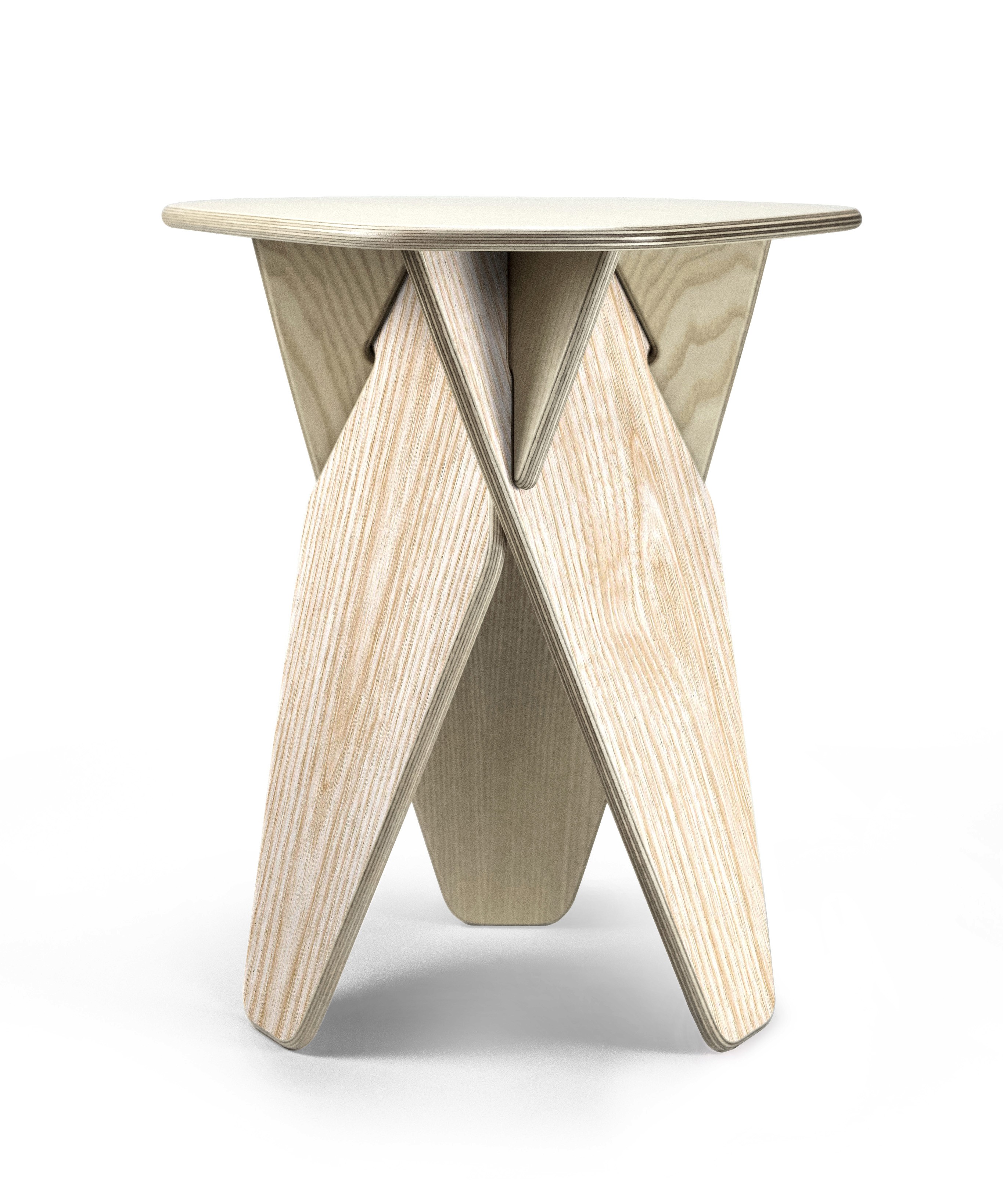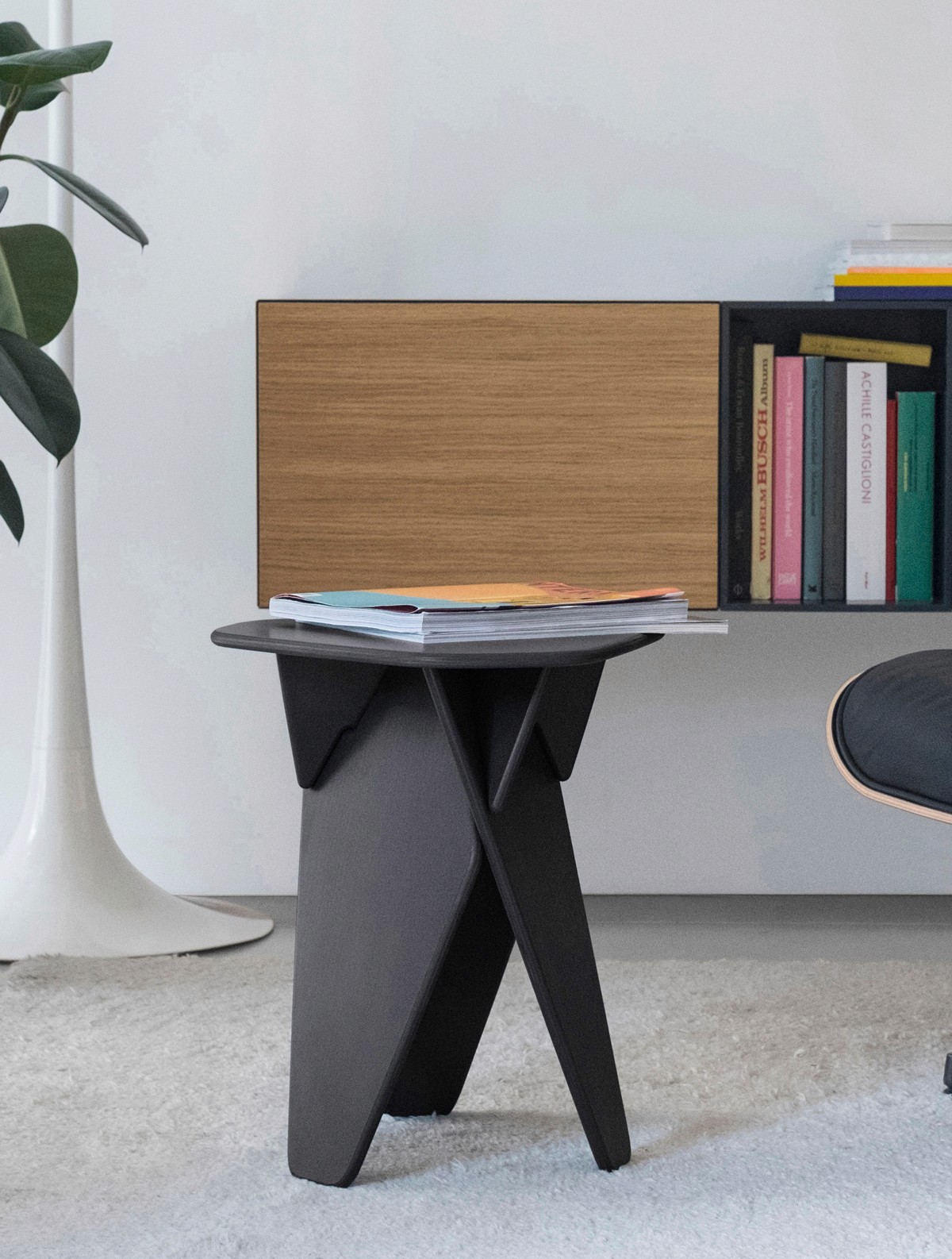 The Wedge Table was developed from the idea of creating a three-dimensional table and stool construction using flat plywood parts. The three interlocking legs form a stable structure and define the characteristic appearance of the design. Every part follows a clear structural logic and the aesthetic principle of necessity. The splayed and tapered legs distribute forces efficiently and prevent tipping. All plywood components can be produced with standard machining processes. The top and base are joined by a three-armed steel connector that completes the structural system. The Wedge Table is available in various material and color options.
